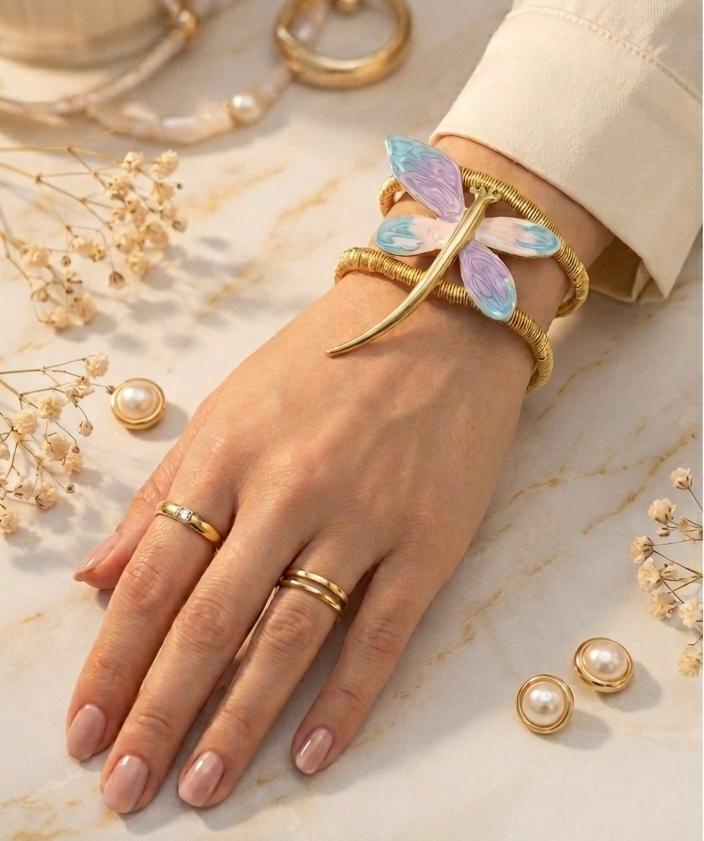Embrace the ethereal beauty of nature with this stunning, handcrafted dragonfly cuff. The bracelet is a statement piece that brings a touch of garden magic to any outfit